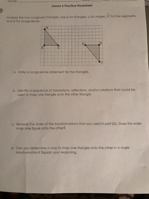 Make a class set of the turn up the music student worksheet printable. Print a copy of the answer key: Complete the worksheet emily's cards quietly at your. However, you must earn the right to retake by completing the reteach worksheet(s) . This task includes an experimental geogebra worksheet, with the intent that instructors might use it to more interactively demonstrate the relevant content . A triangle has the vertices (3, 4), (5, 4) and (5, 2). Apply the indicated series of transformations . Designing with geometry printable for your use. You will have 1 week from the return of the exam to complete the retake. If there is a sequence of rotations, reflections, and translations that take one figure to the other, then they are congruent. This lesson builds understanding of translations, reflections, and rotations using a pairs of congruent triangles on the coordinate plane.